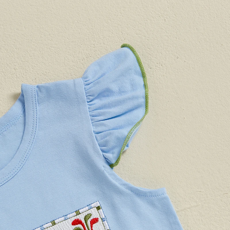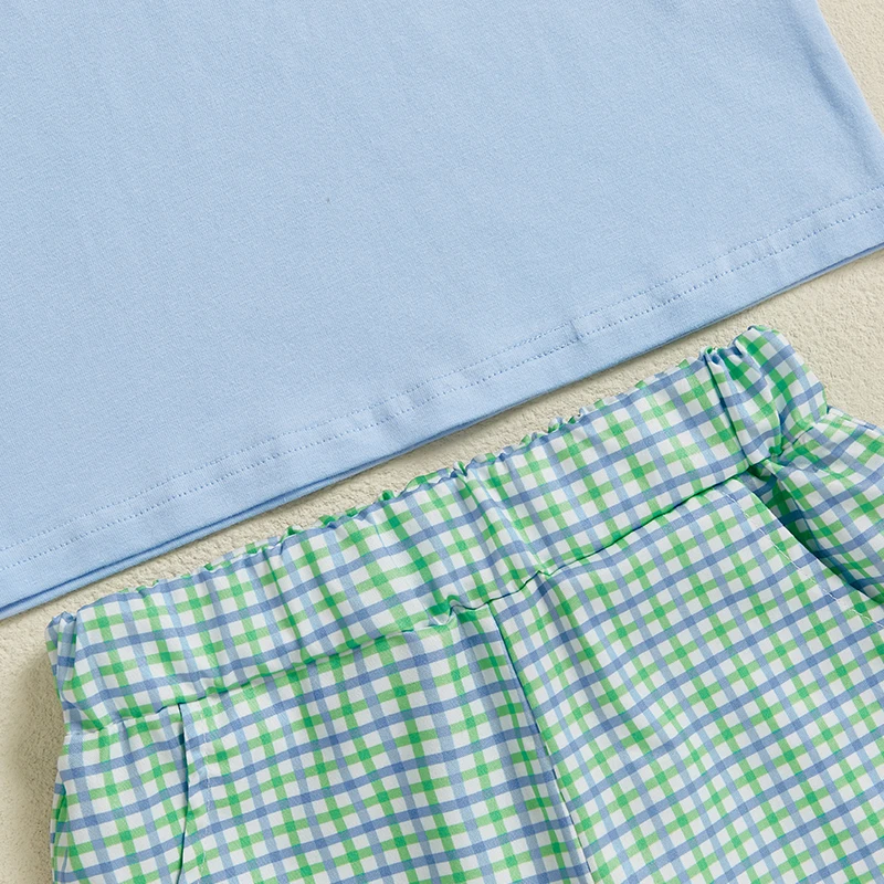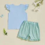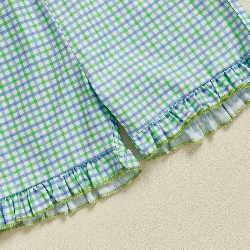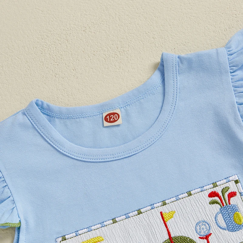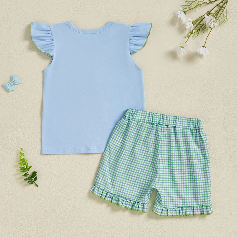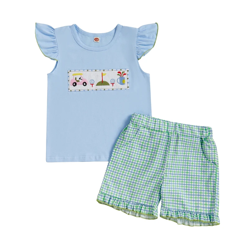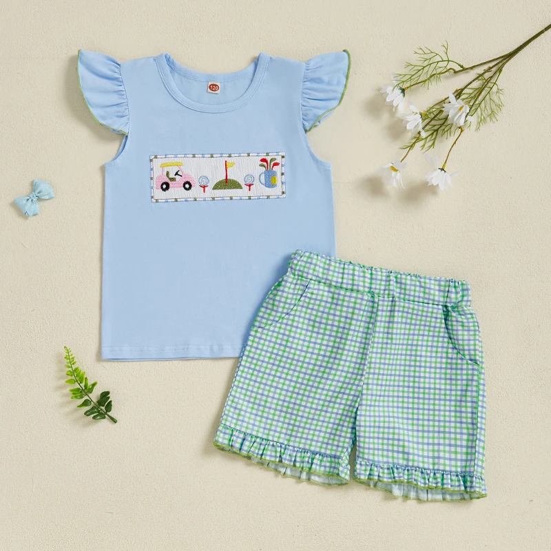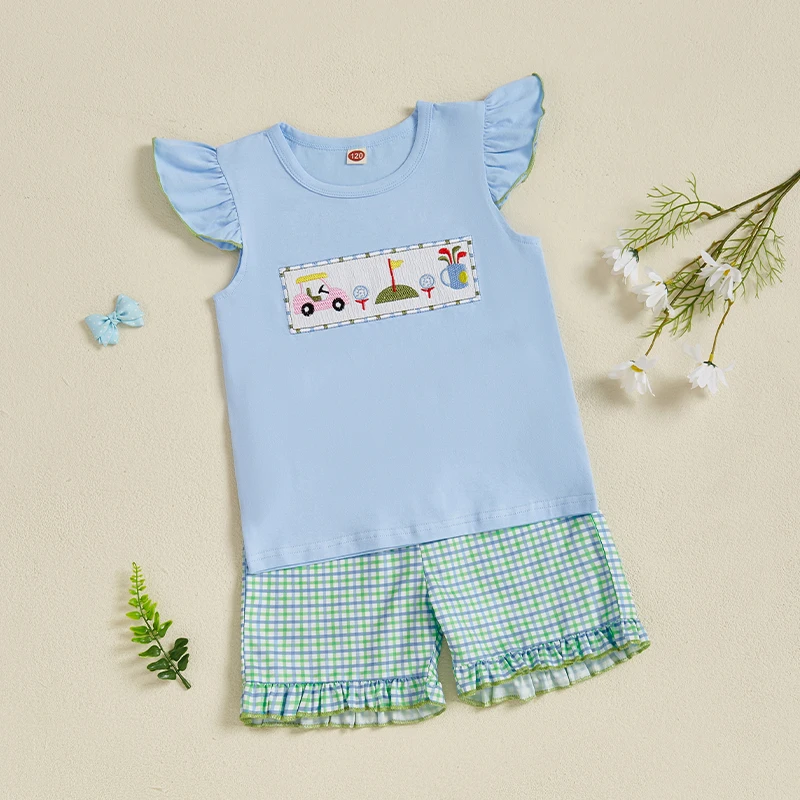 Baby Girls Summer Outfits Golf Embroidery Fly Sleeves Tops and Elastic Ruffle Plaid Shorts Set Fashion Cute Clothes