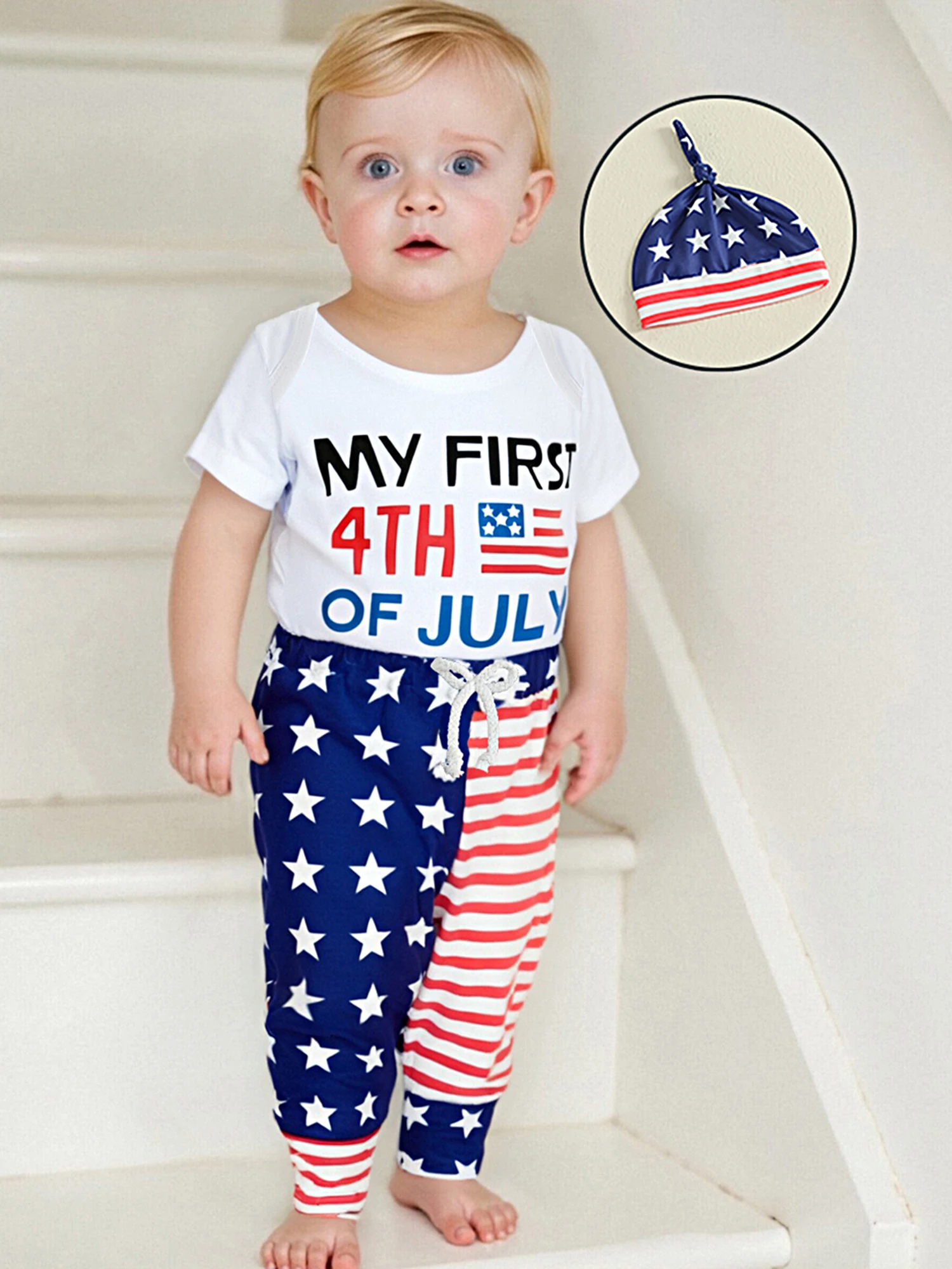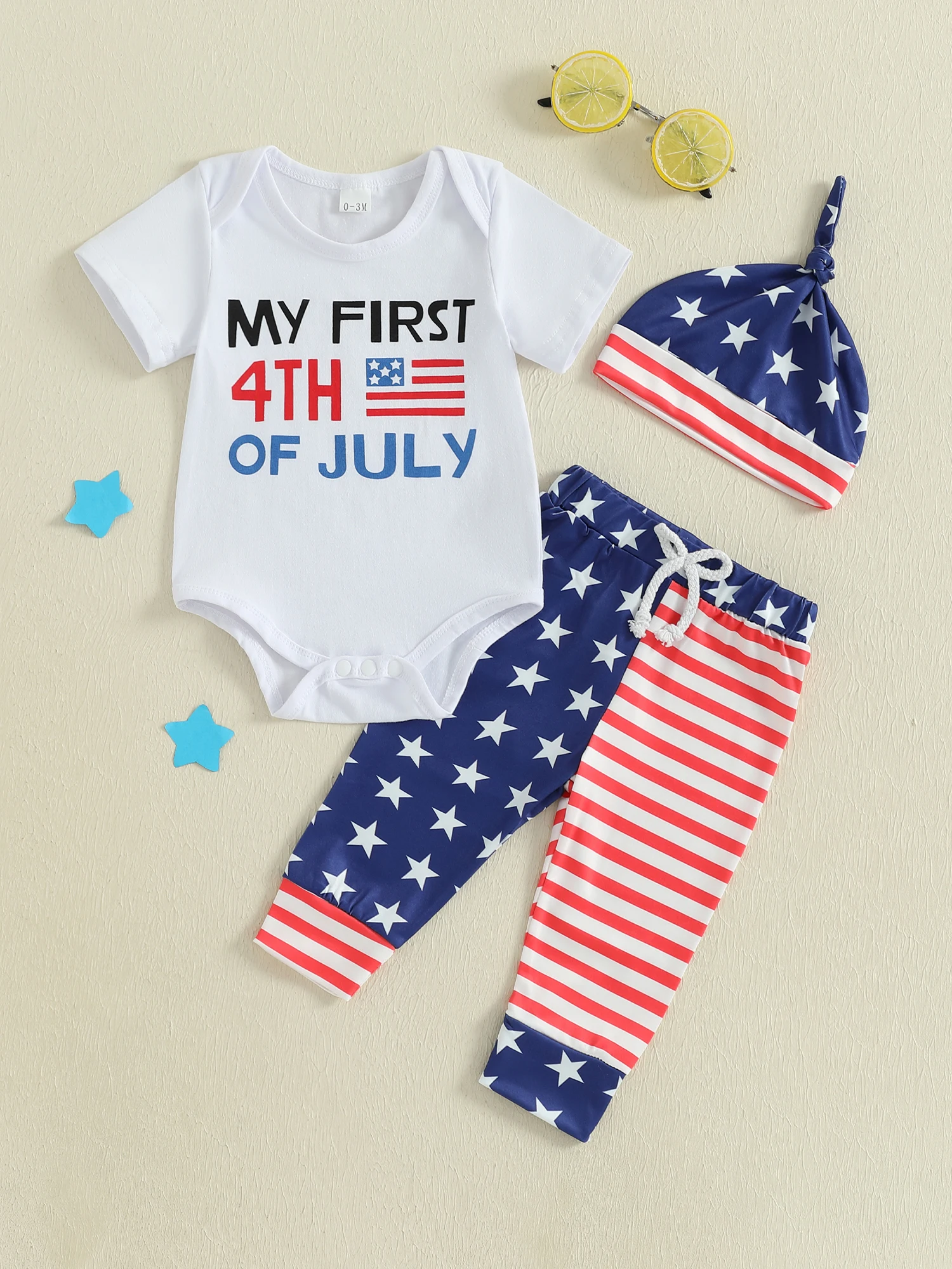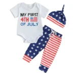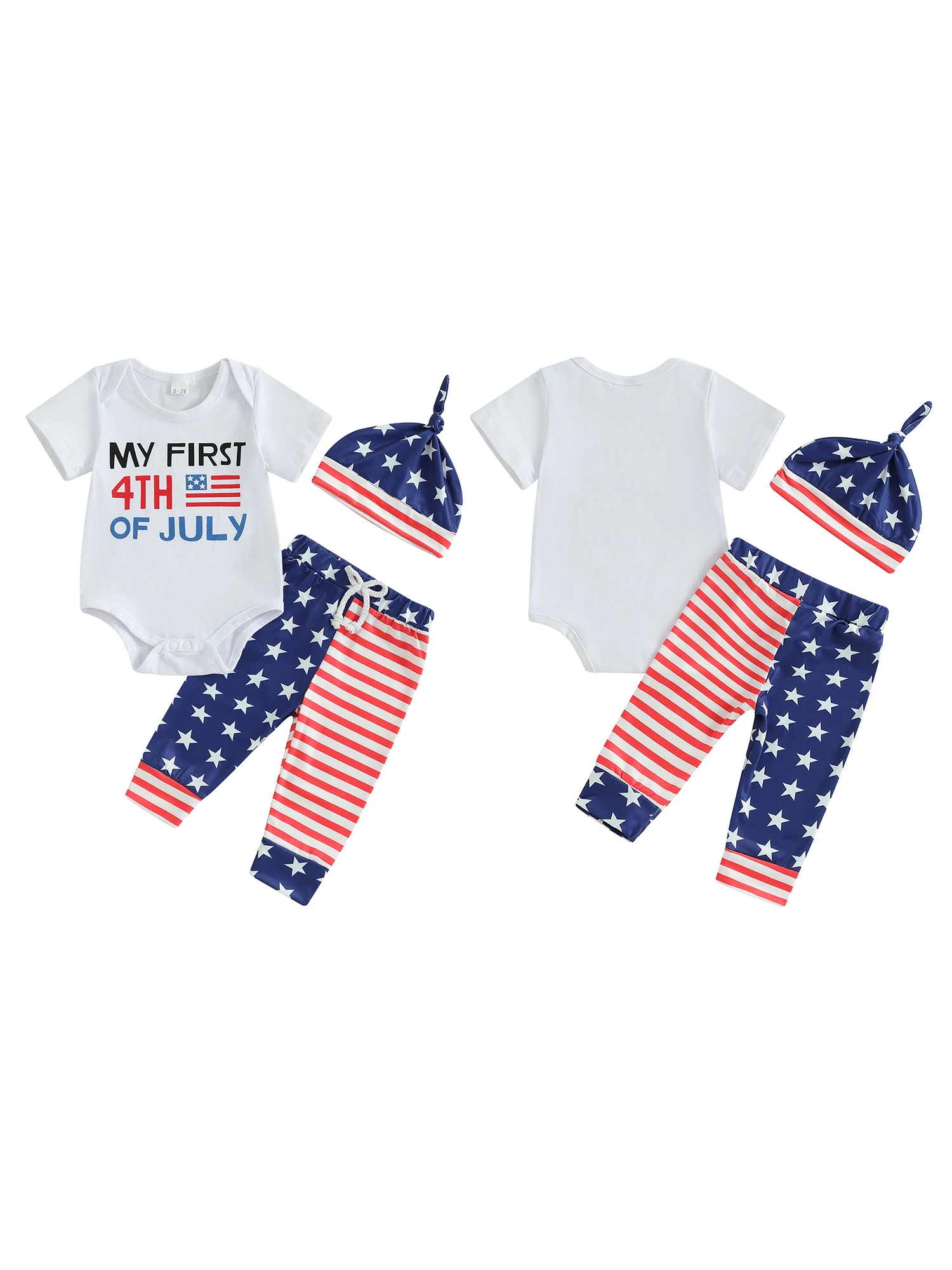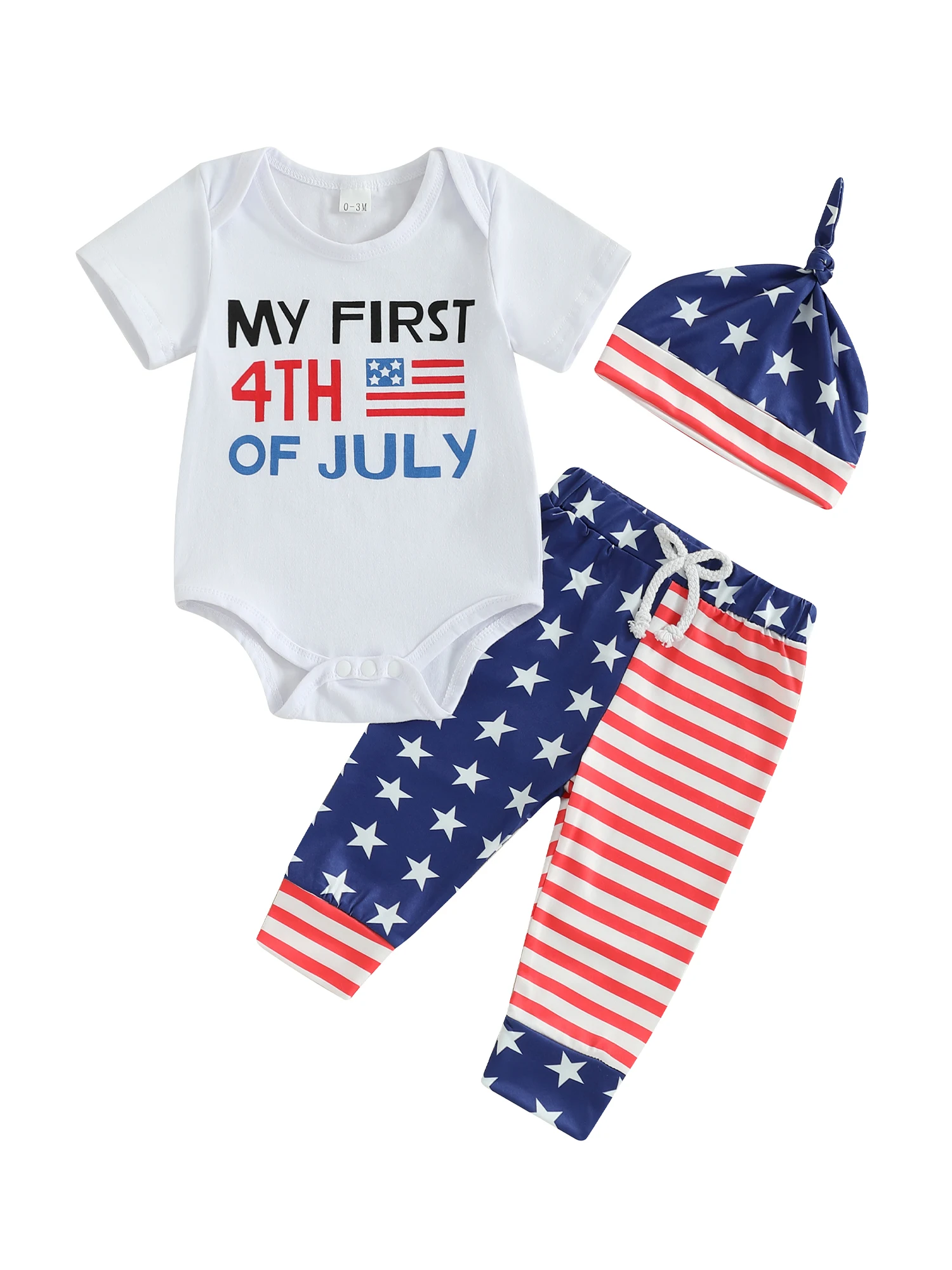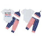 Baby Boys Independence Day Outfits Letter Print Short Sleeve Rompers Star Stripe Print Long Pants Hat 3Pcs Clothes Set