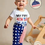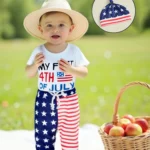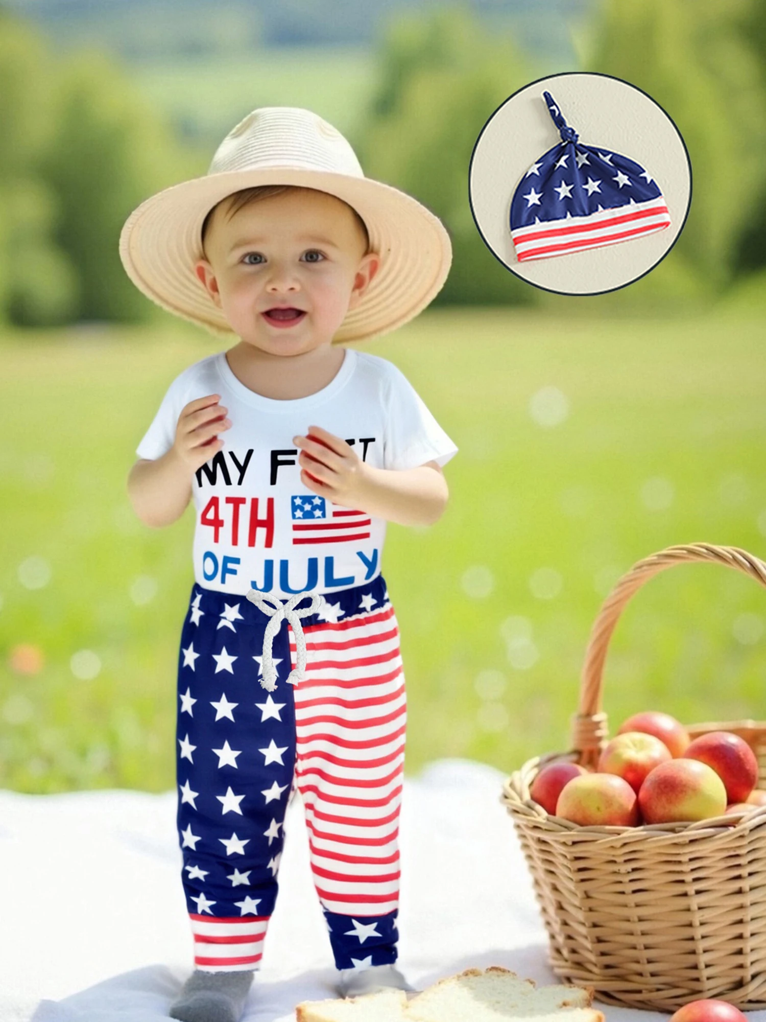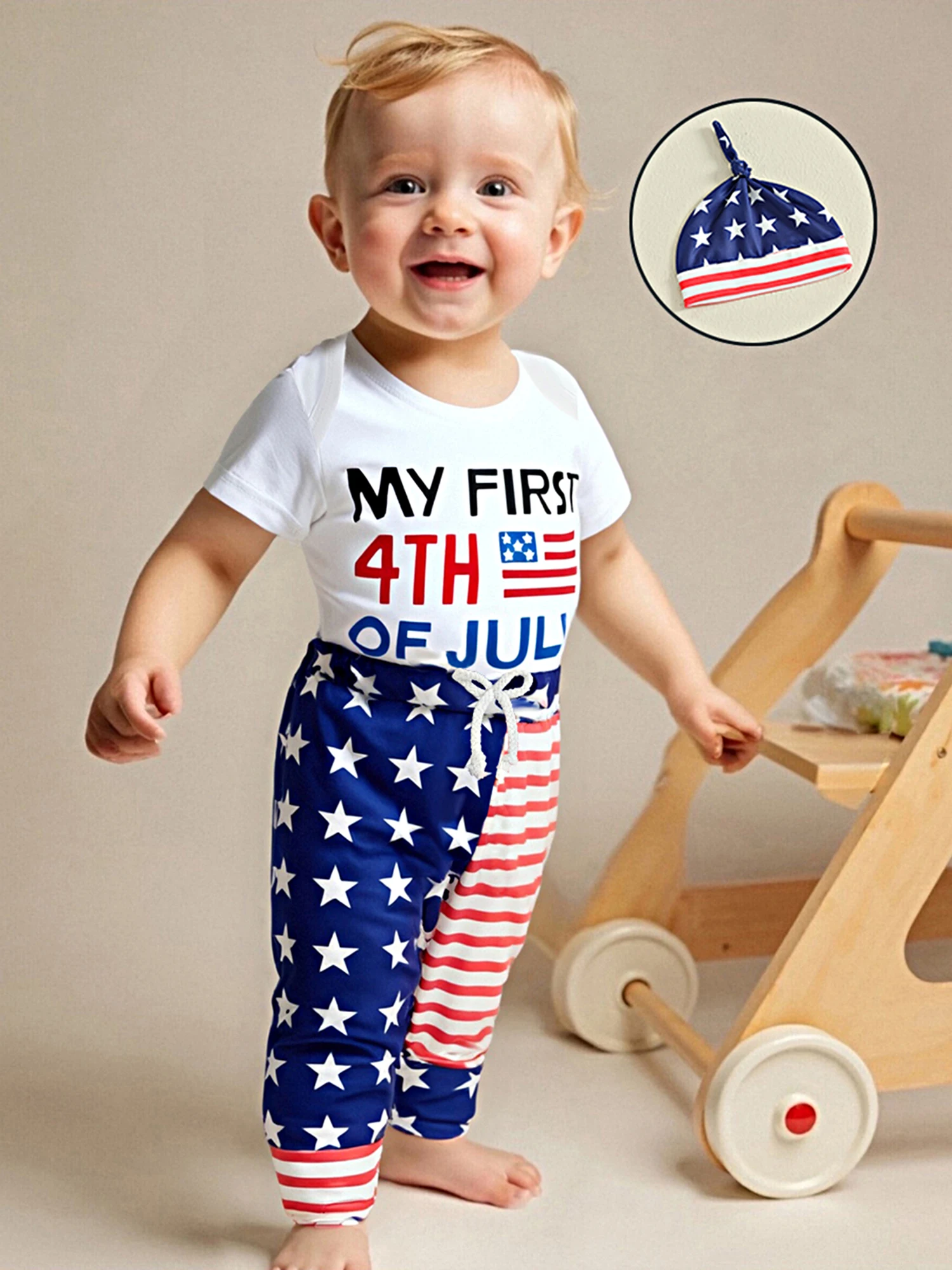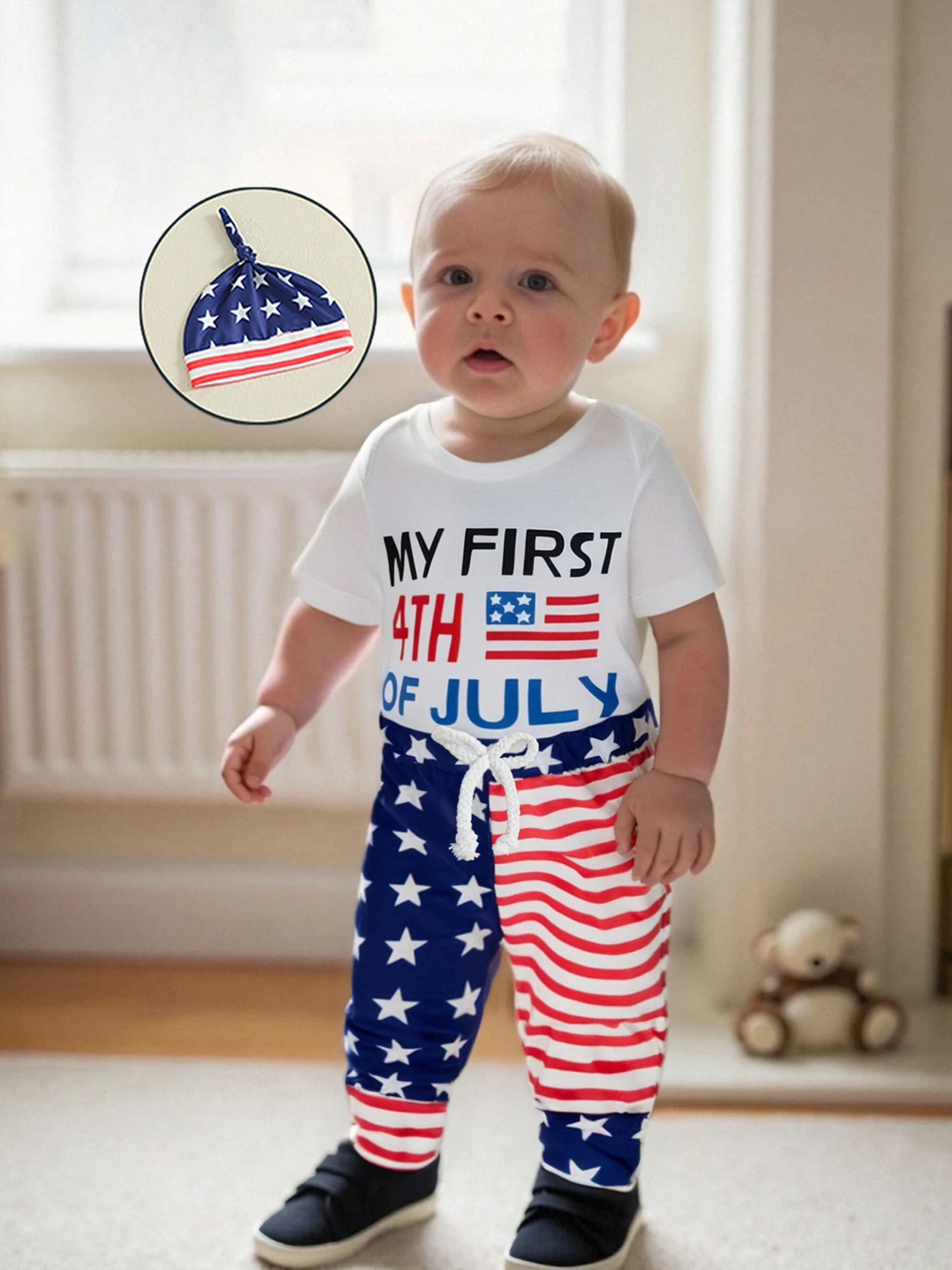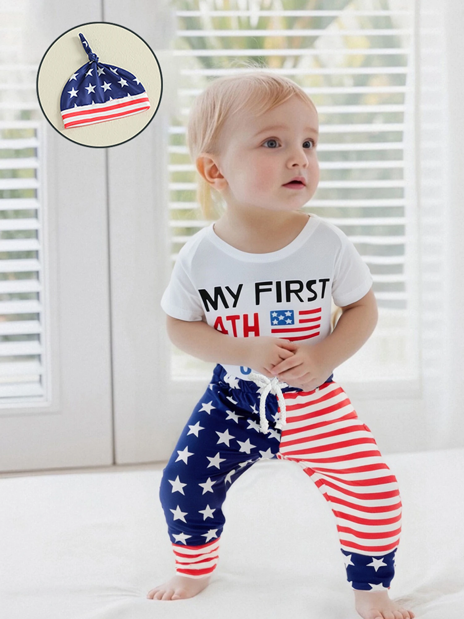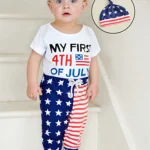 Baby Boys Independence Day Outfits Letter Print Short Sleeve Rompers Star Stripe Print Long Pants Hat 3Pcs Clothes Set