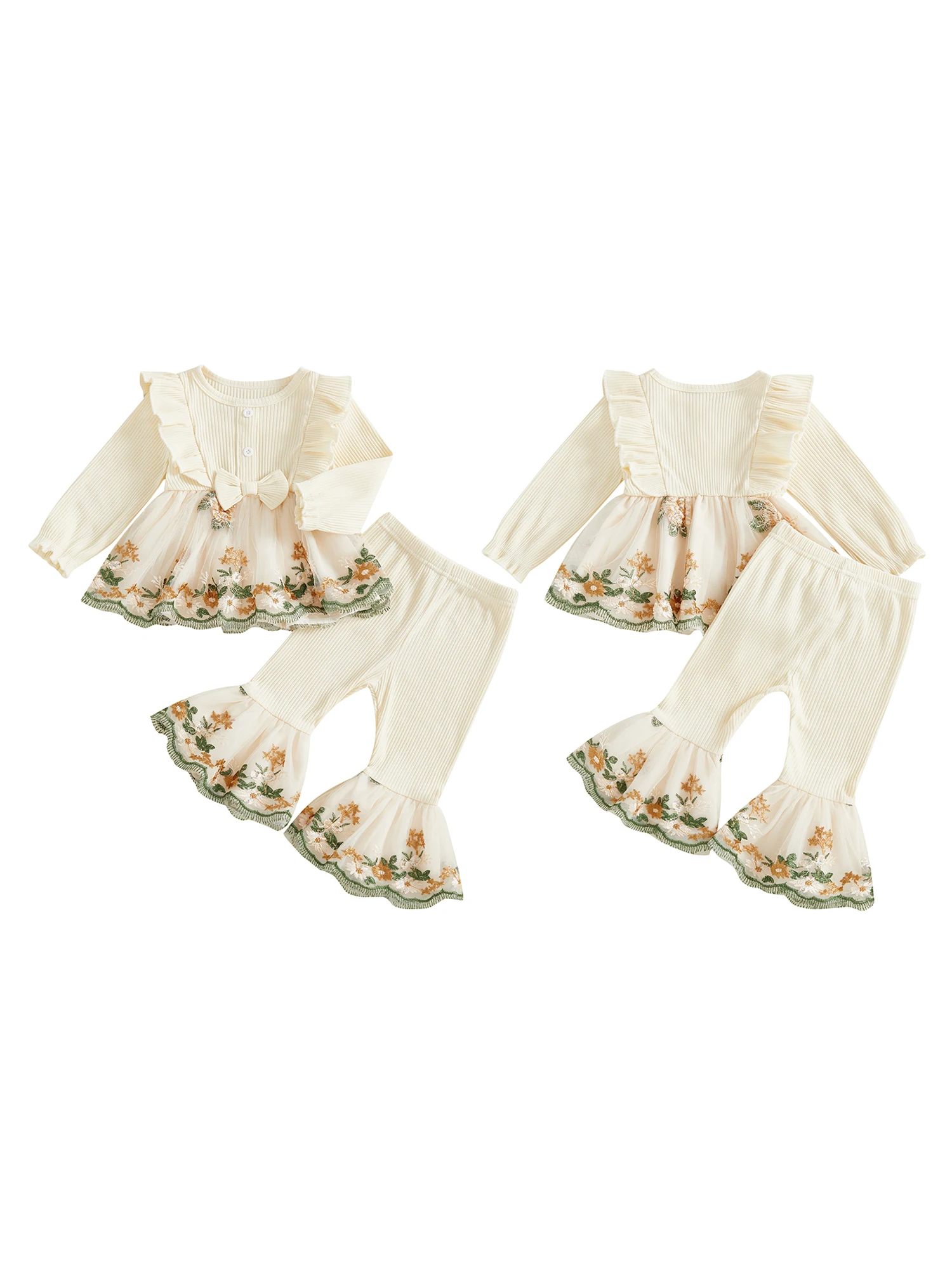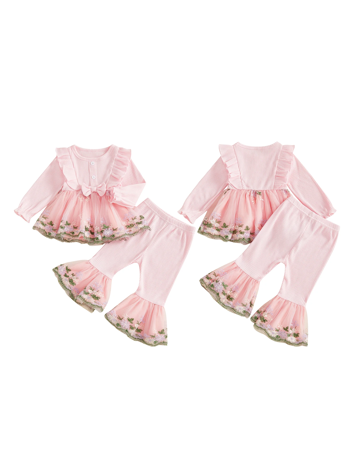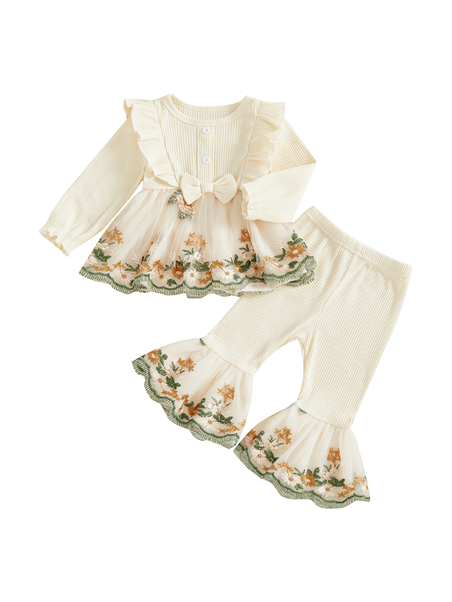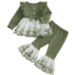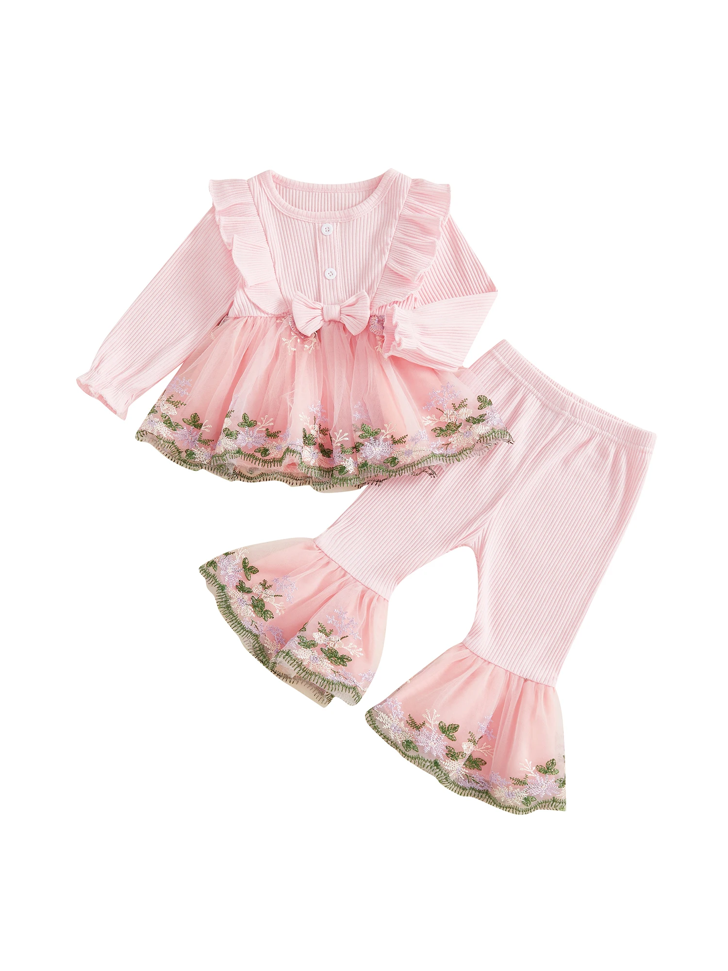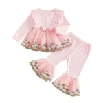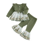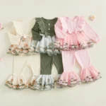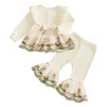 Toddler Baby Girl Fall Winter Outfits Flower Embroidered Ribbed Crew Neck Long Sleeve A Line Tops and Bell Bottoms 2 Pcs Set
