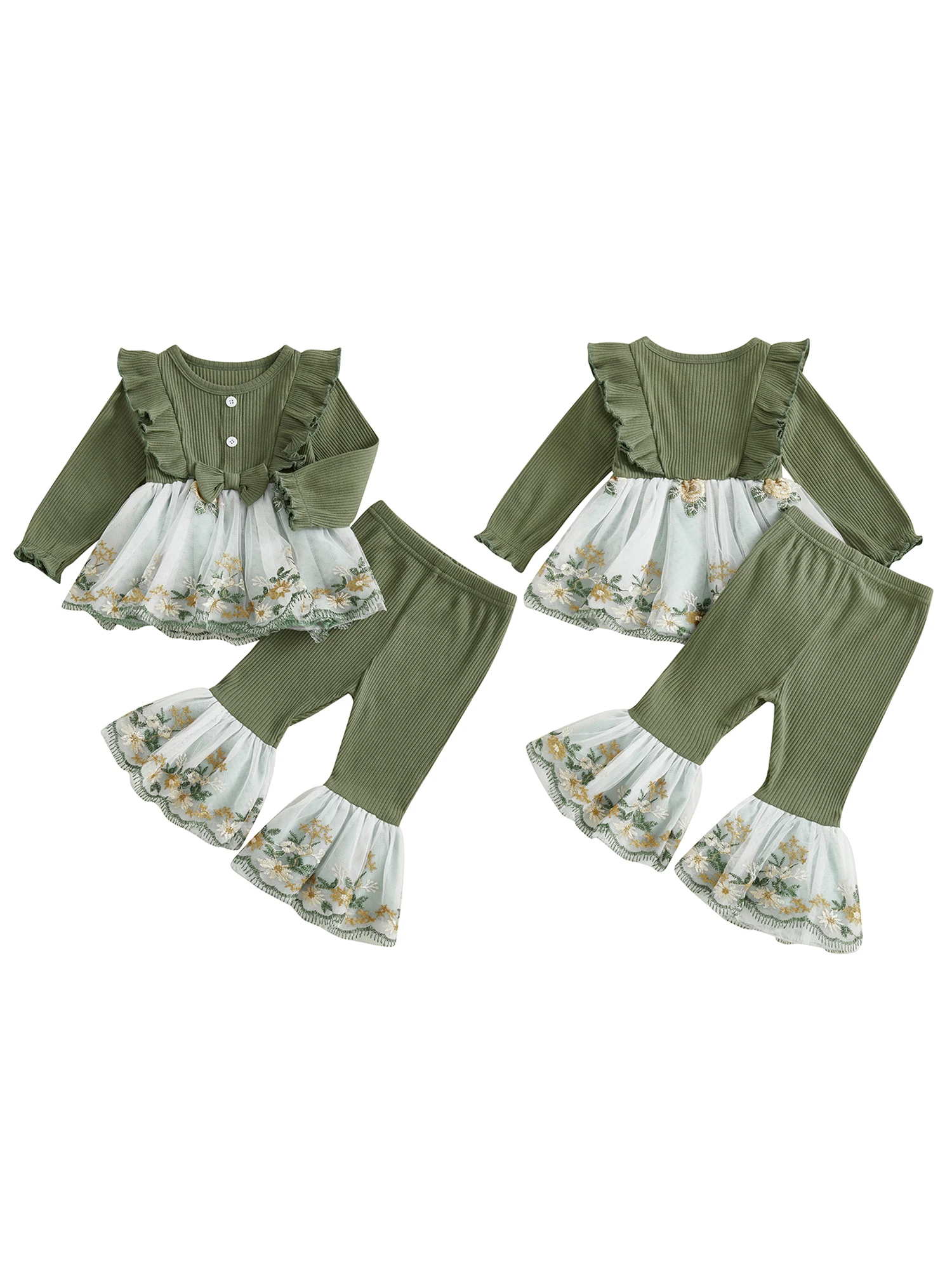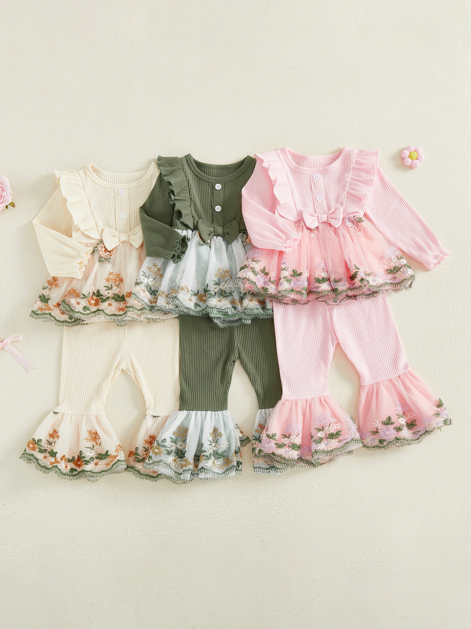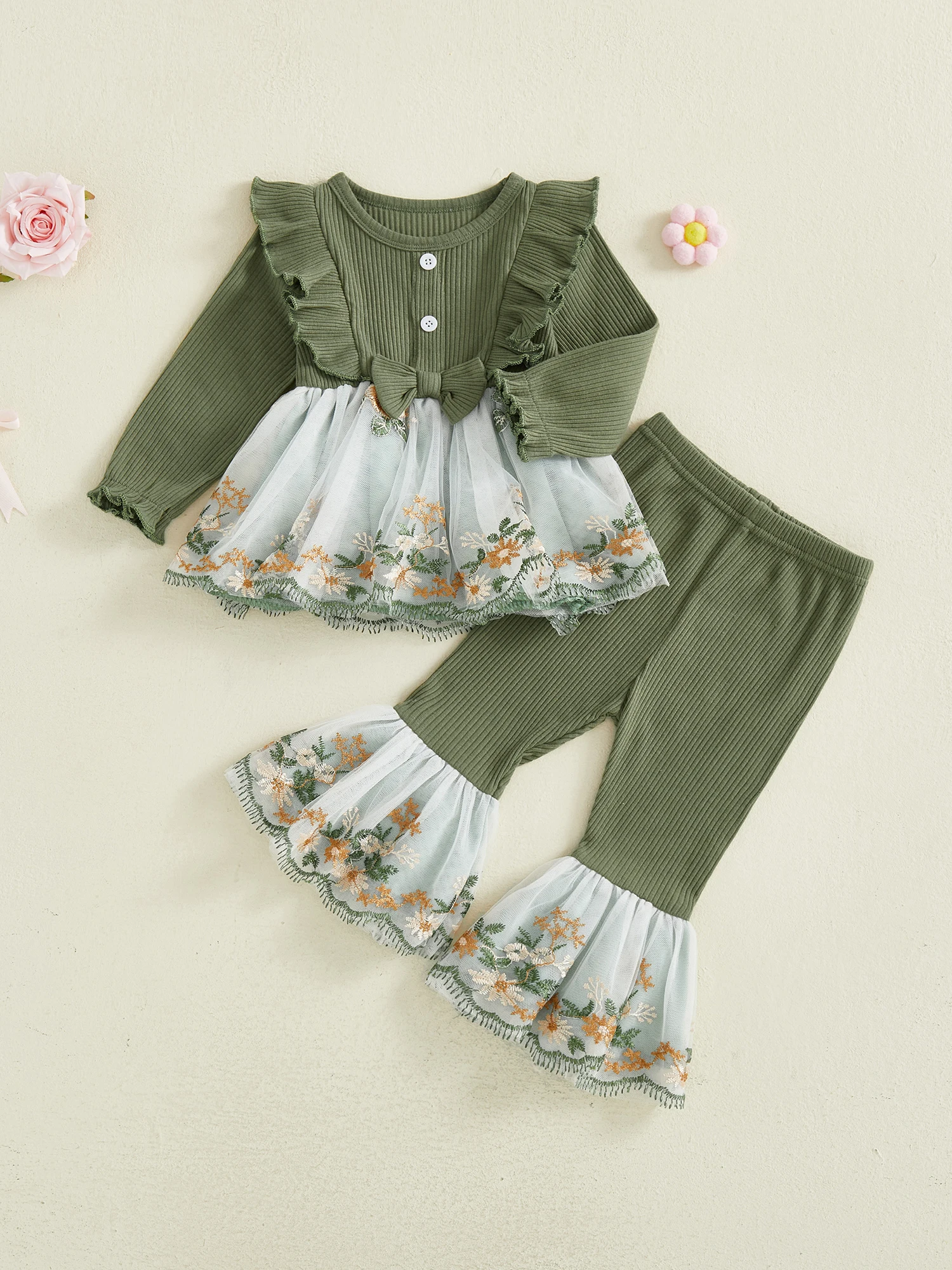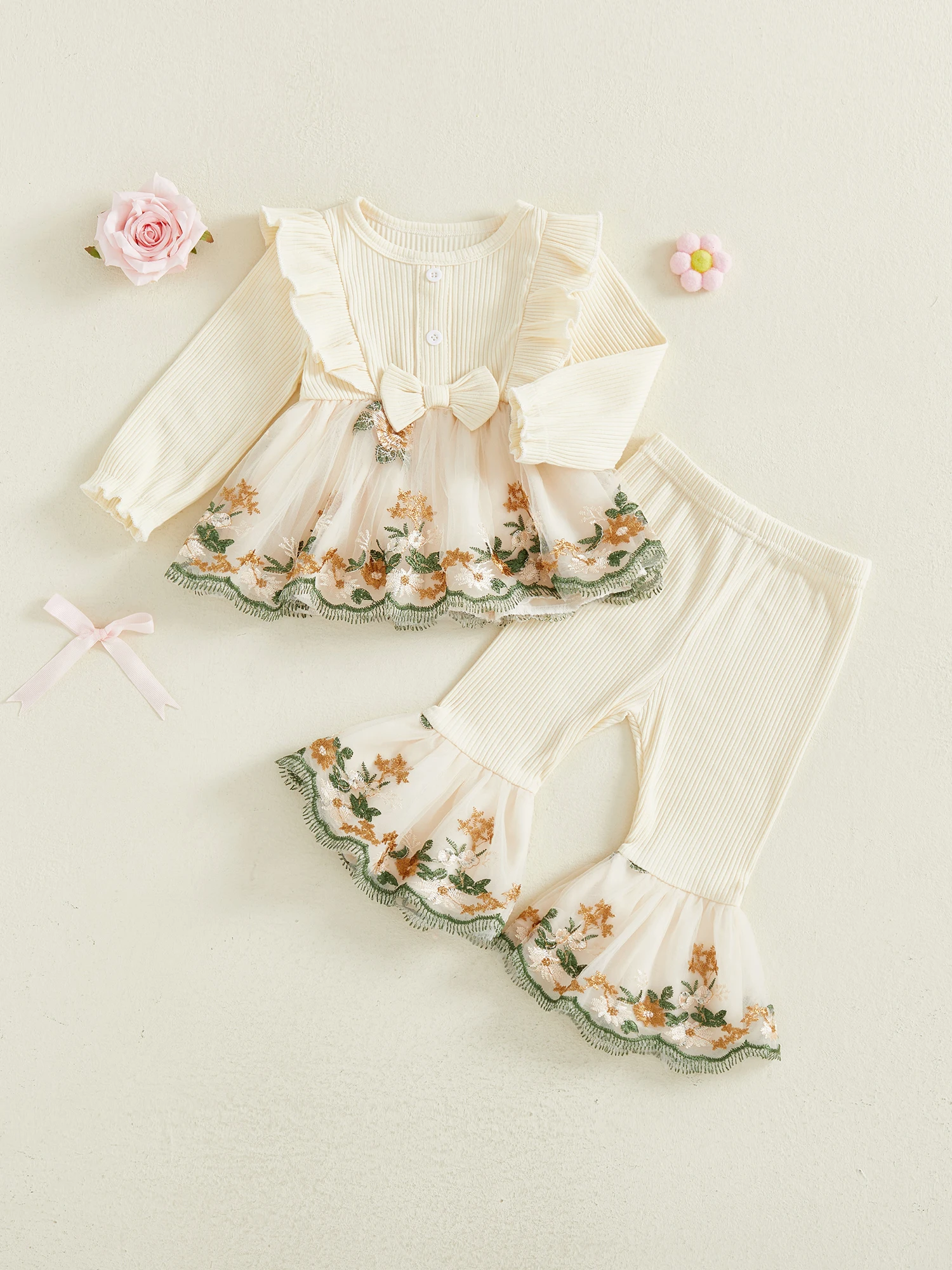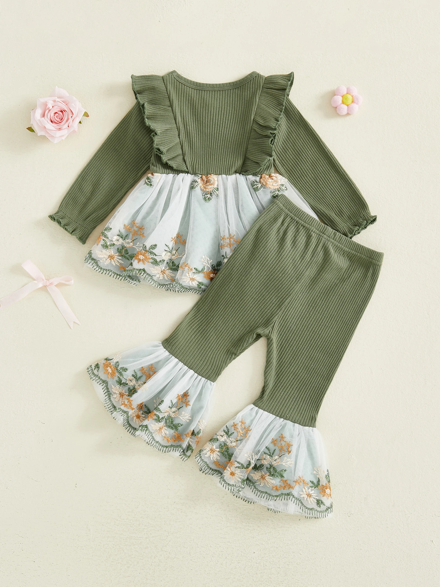 Toddler Baby Girl Fall Winter Outfits Flower Embroidered Ribbed Crew Neck Long Sleeve A Line Tops and Bell Bottoms 2 Pcs Set