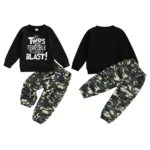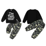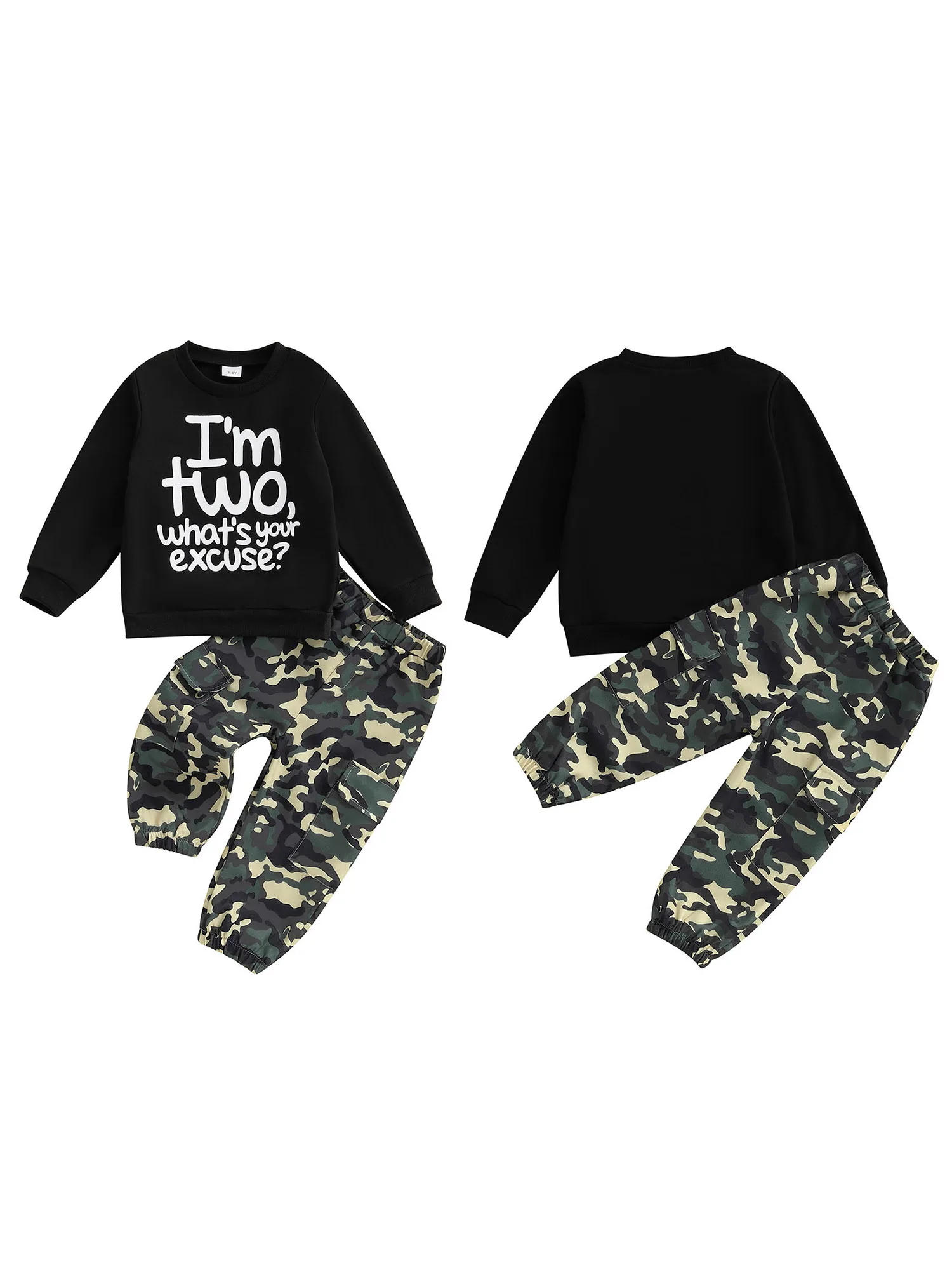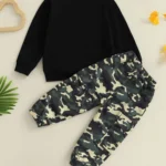 Boy sweatshirt with letter print, round neck and long sleeve design; pants with camouflage print and elastic waist.