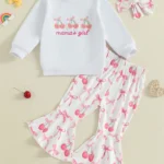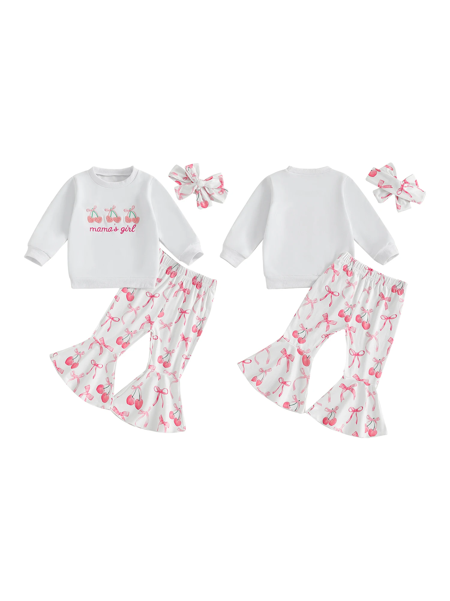 Baby girl sweatshirt with cherry embroidery, long sleeves, Baby girl flared pants with bow print, elastic waist design, and headband set; .