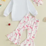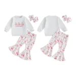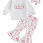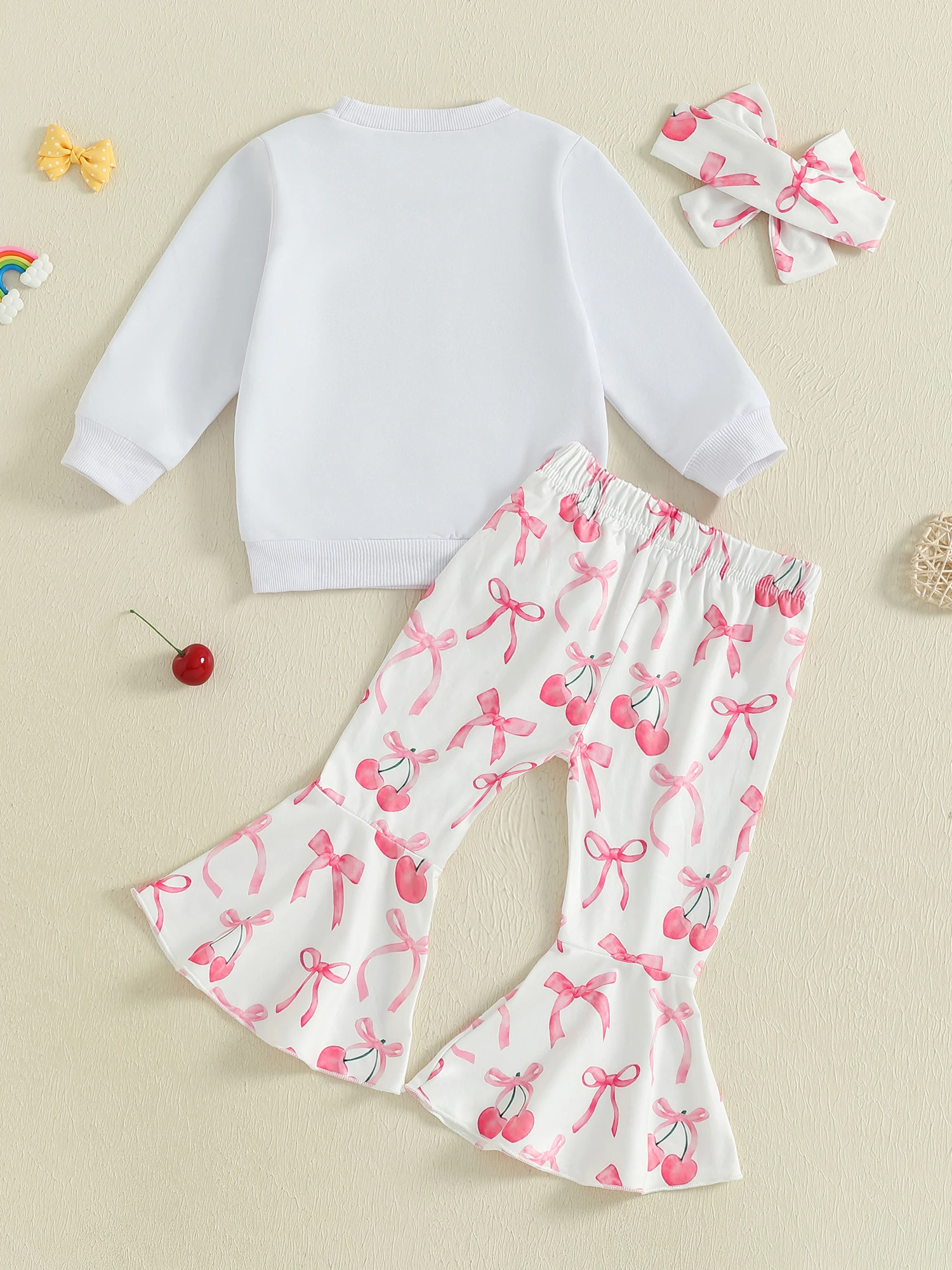 Baby Girls Cute Outfits Cherry Embroidery Long Sleeve Sweatshirt and Bow Print Flared Pants Headband Set 3 Piece Clothes