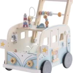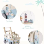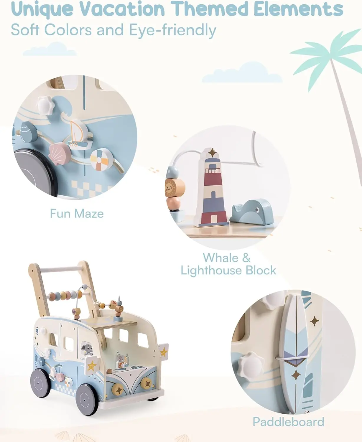 Designed with an adorable ocean beach pattern on a holiday bus, this wooden walker is perfect for babies taking their first steps. The adjustable wheel tension knobs allow you to customize the looseness or tightness of the wheels, ensuring it moves at your child's pace for added safety.